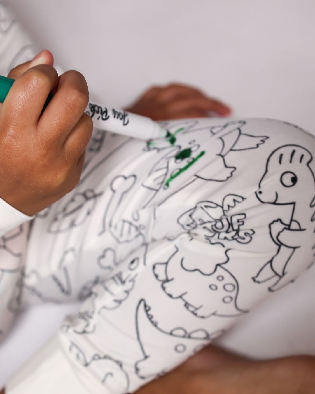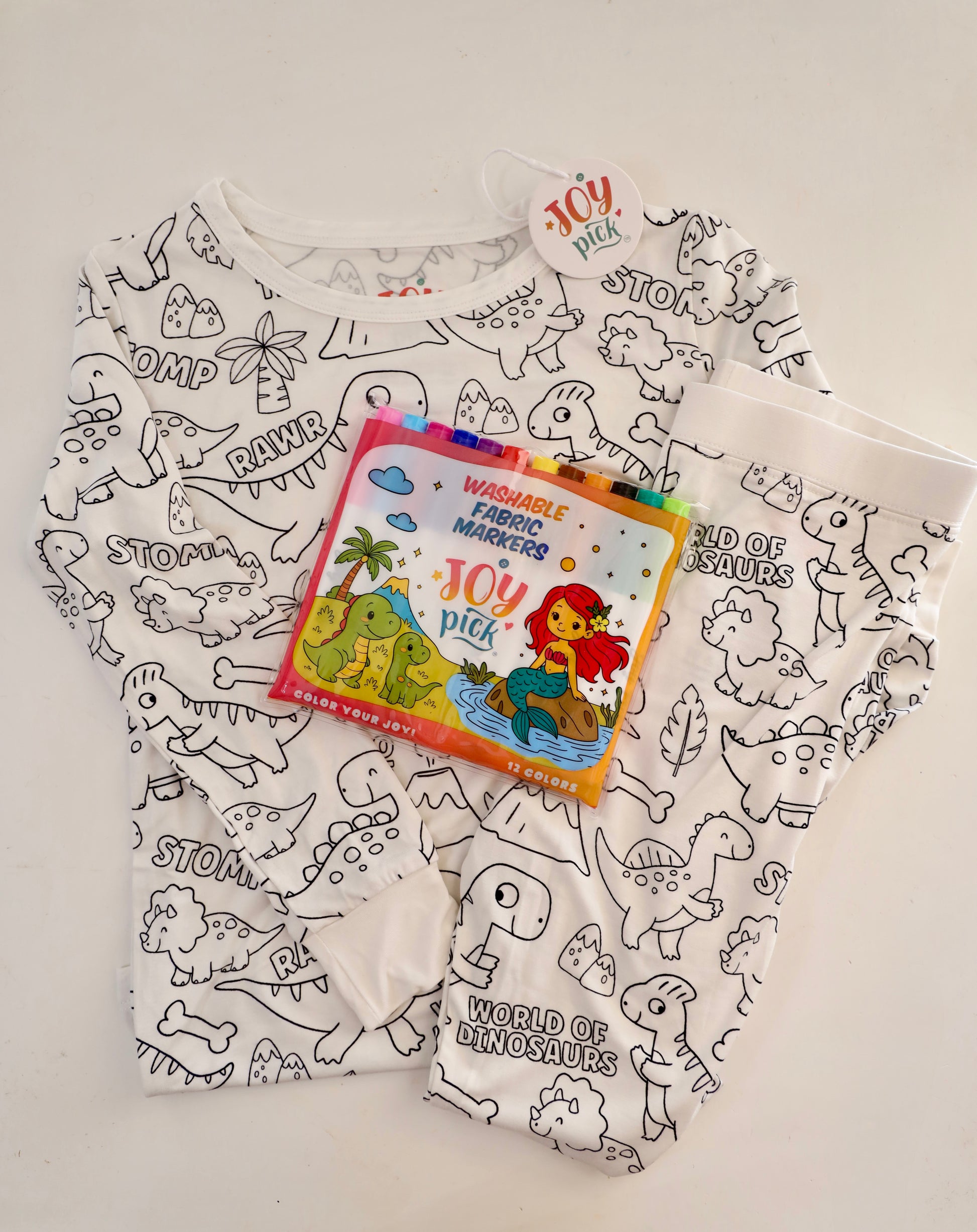 Dive into creativity with our Dinosaur Colorable Pajamas – a soft and playful outfit designed for all-day imagination. Made from silky bamboo viscose, this two-piece set is more than just clothing—it’s a canvas your child can bring to life with their own colorful touch. Whether lounging at home, crafting, or showing off their latest masterpiece, kids will love wearing their art in comfort.